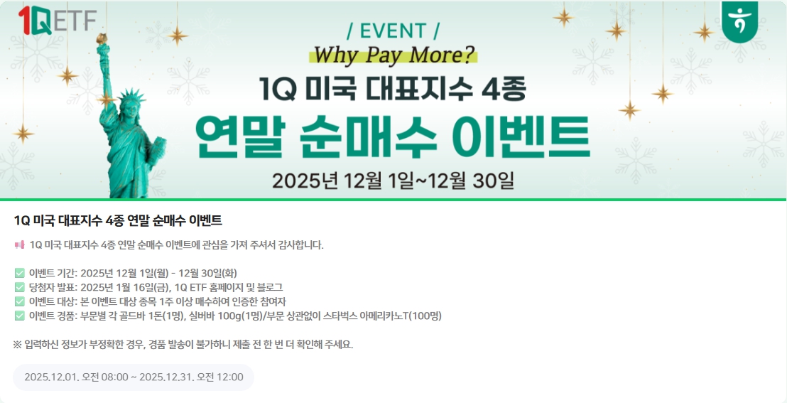 하나자산운용(1Q)이 ‘업계 최저 수준 보수’와 ‘순금 이벤트’라는 두 가지 승부수를 동시에 던졌습니다. 12월이 지나면 사라지는 기회인 만큼, 긴급하게 핵심만 정리해 드립니다.