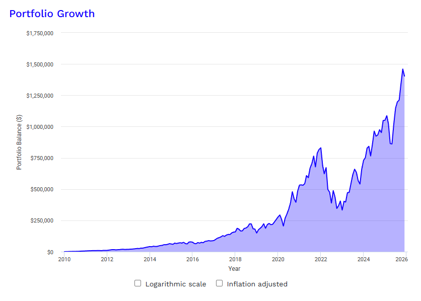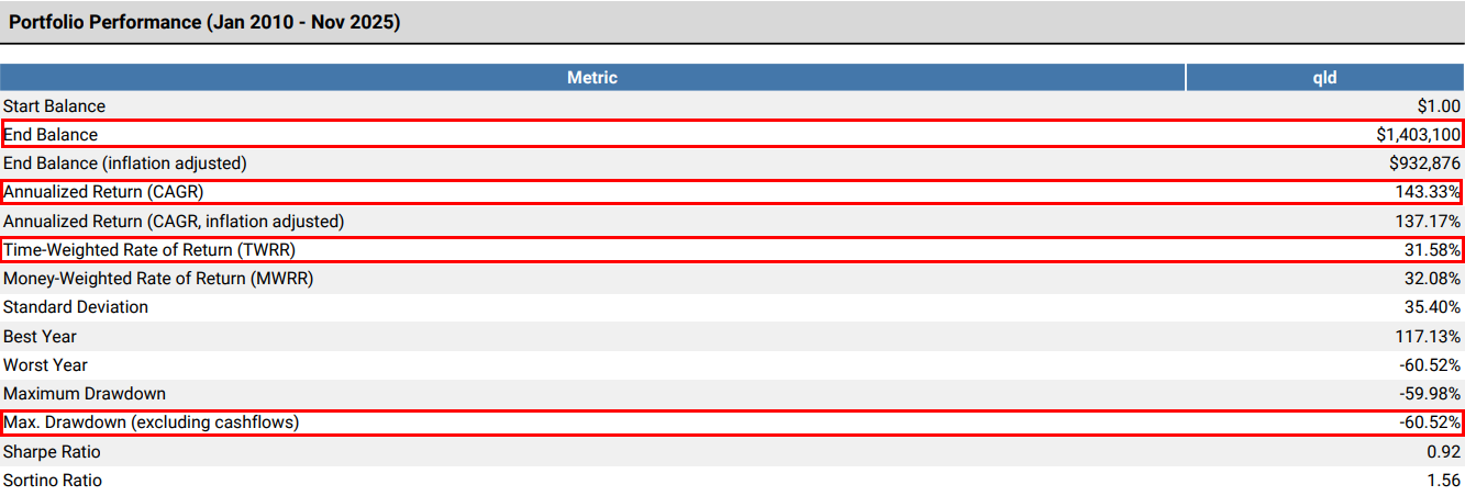 이 프로젝트의 핵심은 ‘시간’과 ‘복리’입니다. 과연 월 50만원 10억 만들기가 가능할까요? 지난 15년(2010년~2025년)간의 나스닥 2배 레버리지(QLD) 성과를 기반으로 백테스트를 진행해 보았습니다.